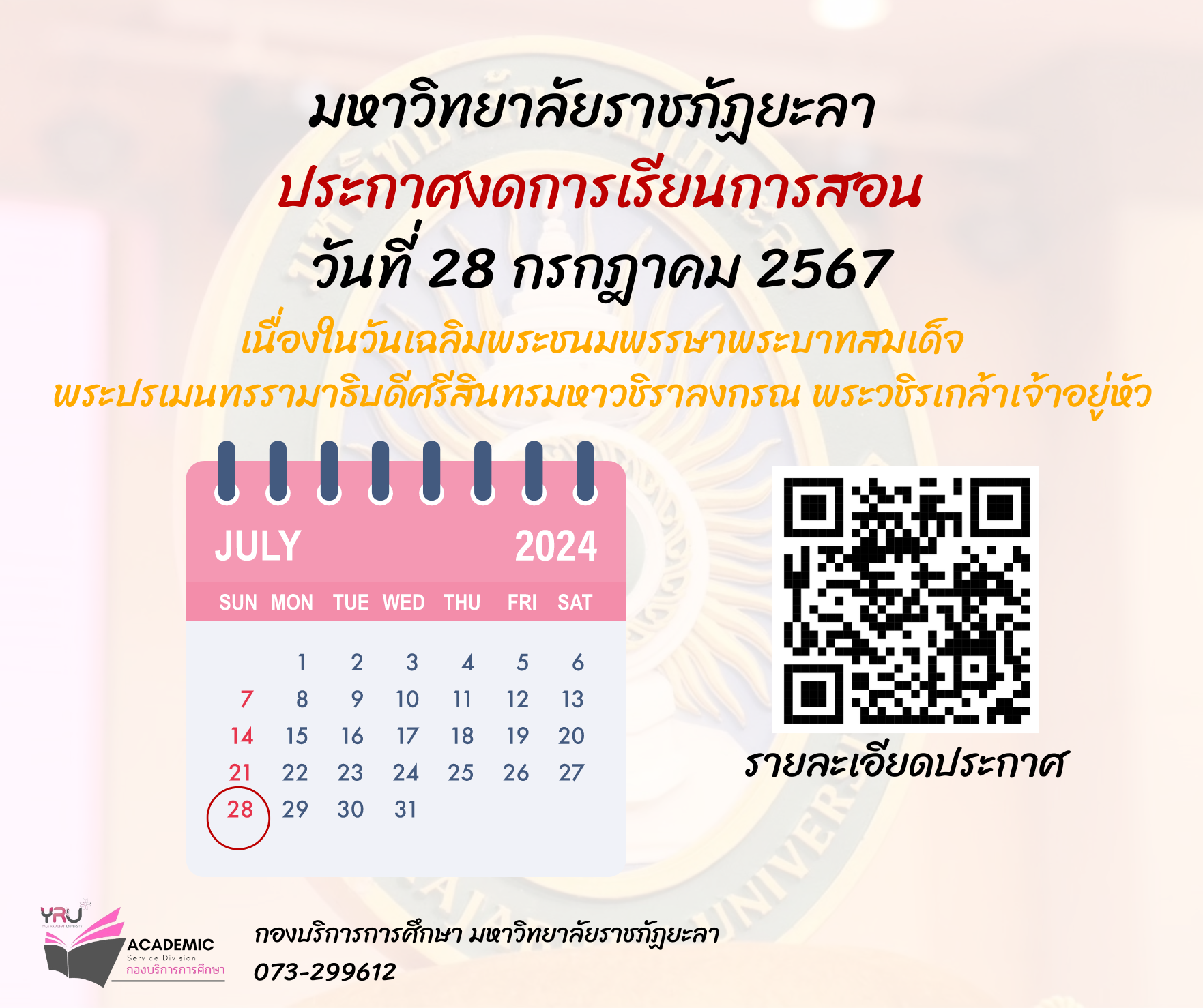 มหาวิทยาลัยราชภัฏยะลา จึงขอประกาศงดการเรียนการสอนสำหรับโครงการการจัดการศึกษาสำหรับบุคลากรประจำการ