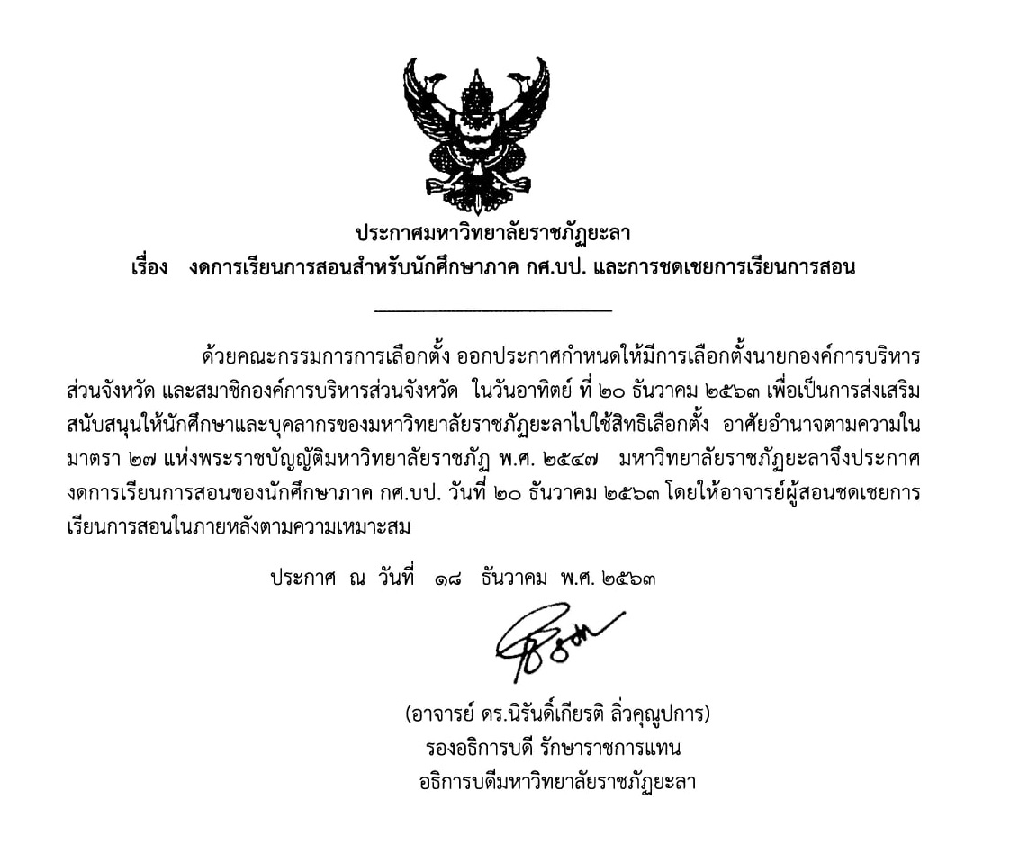 ประกาศมหาวิทยาลัยราชภัฏยะลา เรื่อง งดการเรียนการสอนสำหรับนักศึกษาภาค กศ.บป. ในวันที่ 20 ธันวาคม 2563 และการชดเชยการเรียนการสอน